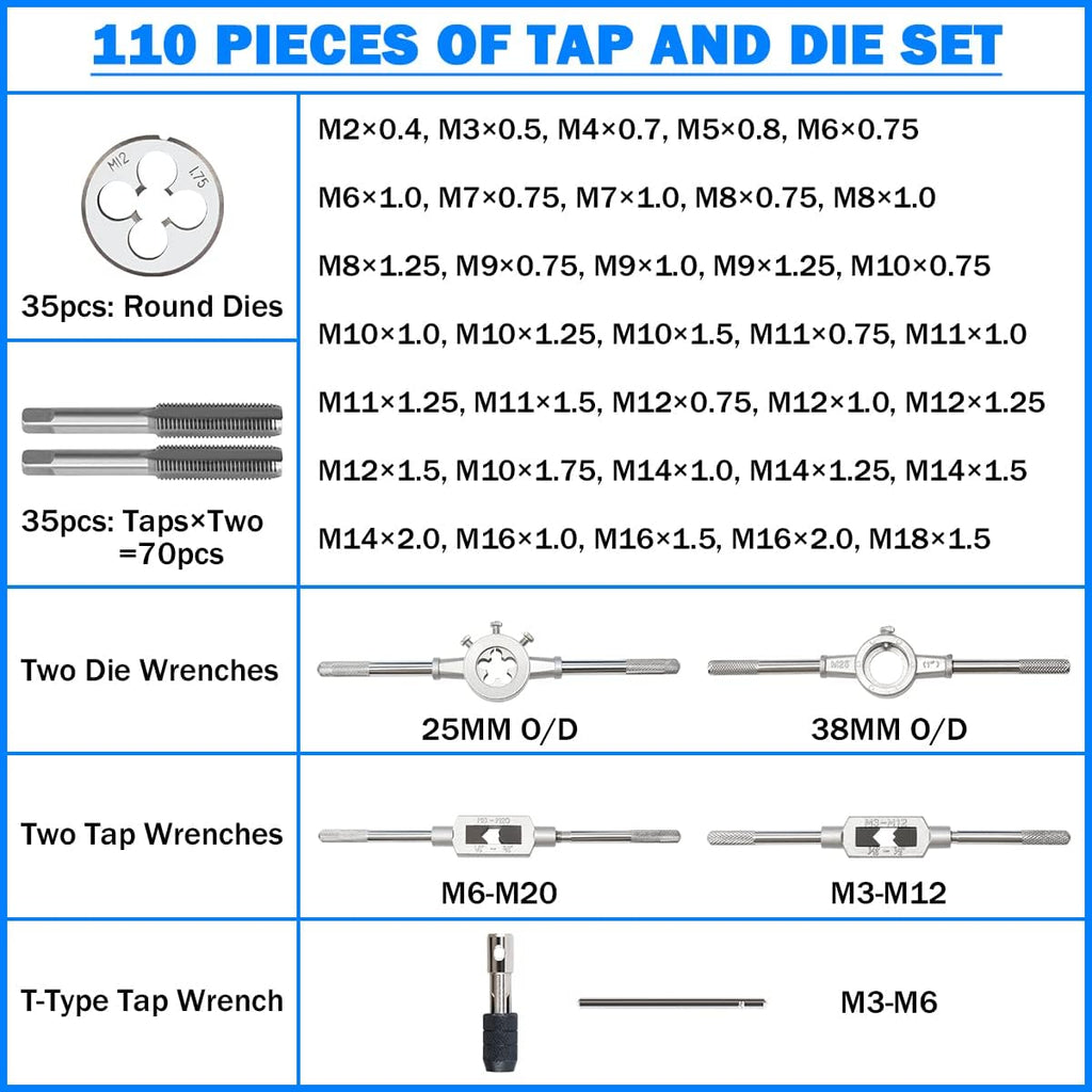 • Kit Includes - 110 PCS Rethreading Kit: 70 Taps + 35 Dies + 2 x Tap Wrenches + 2 Dies wrenches + 1 T-Type Tap Wrench.